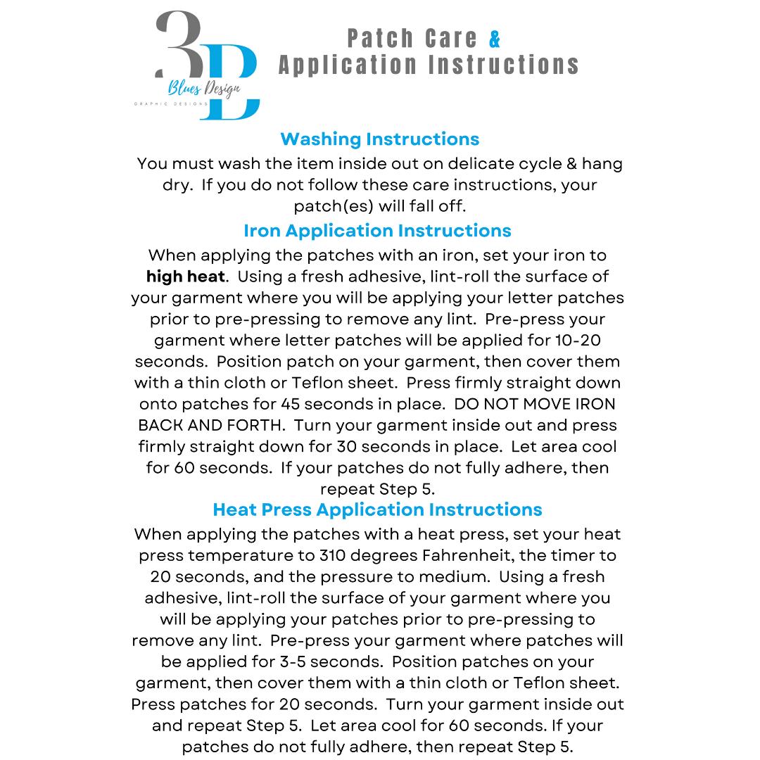 When applying the patches with an iron, set the iron to high heat. Using a fresh adhesive, lint-roll the surface of your garment where you will be applying your letter patches prior to pre-pressing to remove any lint. Pre-press your garment where letter patches will be applied for 10-20 seconds. Position patch on your garment, then cover them with a thin cloth or Teflon sheet. Press firmly straight down onto patches for 45 seconds in place. DO NOT MOVE IRON BACK AND FORTH. Turn your garment inside out and press firmly straight down for 30 seconds in place. Let area cool for 60 seconds. If your patches do not fully adhere, then repeat Step 5.
