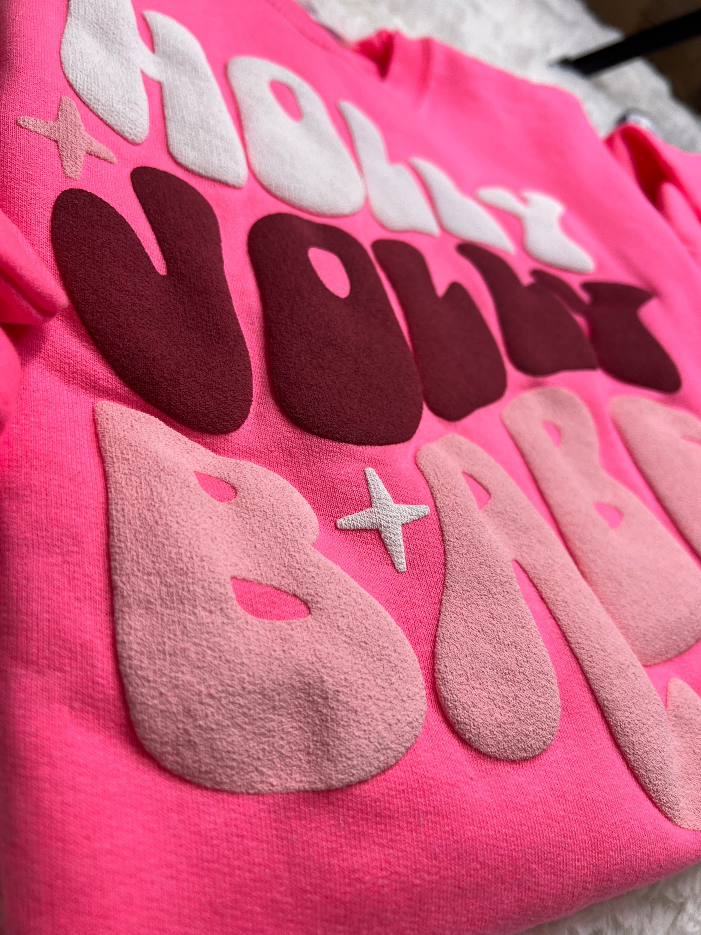 professionally screen printed on hot pink port & co sweatshirts with puff ink!