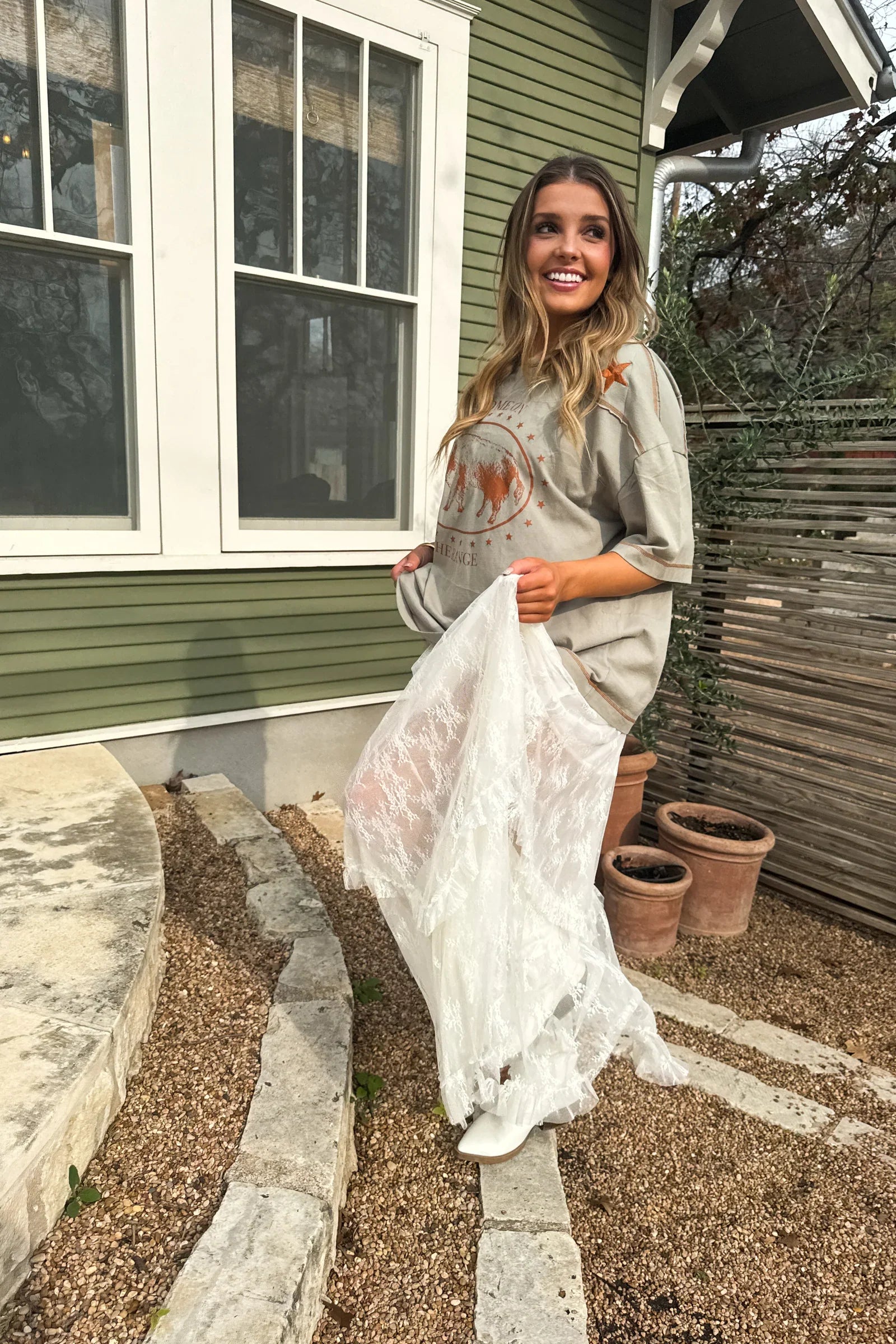 HOME ON THE RANGE: A soft, relaxed graphic tee featuring a vintage-inspired “Home on the Range” buffalo print and embroidered horseshoe and star details on the shoulders. Easy, oversized fit with a lived-in feel—perfect for effortless, everyday styling.