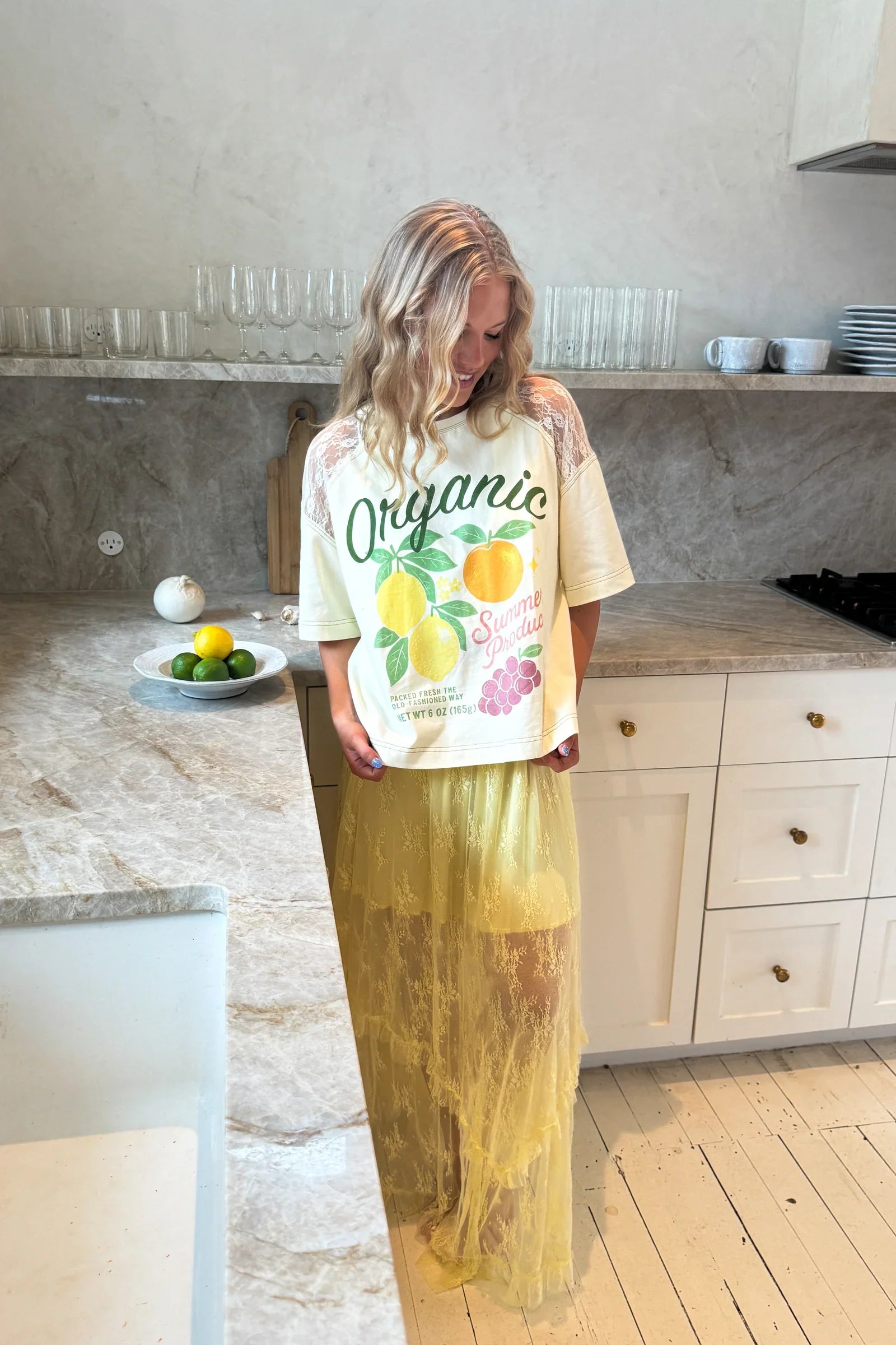 FRUIT TEE: A cheerful graphic tee featuring a colorful “Organic Summer Produce” design. Finished with soft lace sleeve detail and a relaxed fit for an easy, sunny-day vibe.