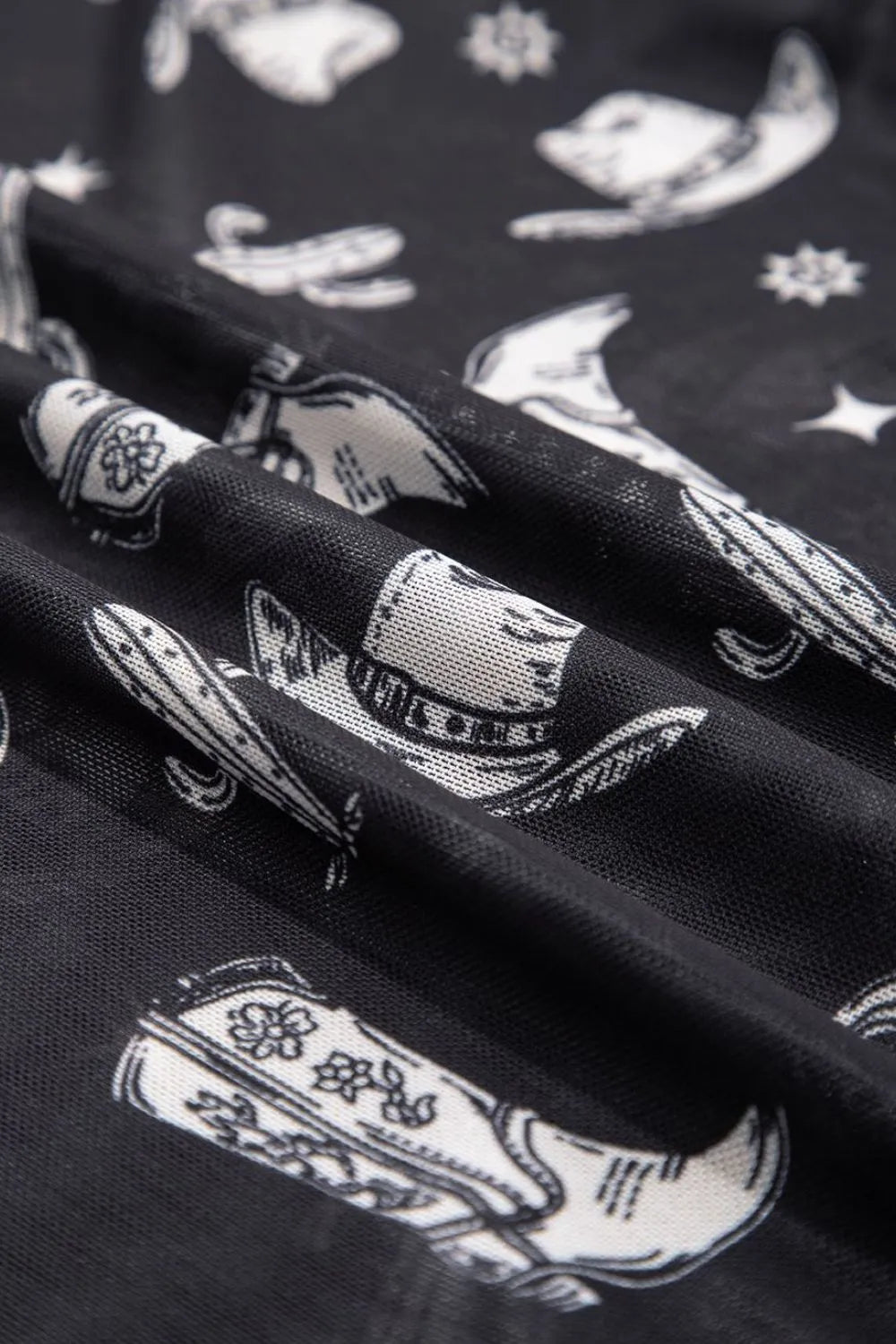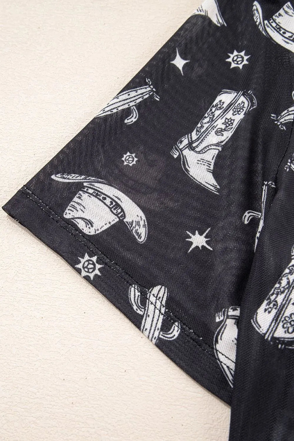 Western Pattern Mesh Sheer Crew Neck Top