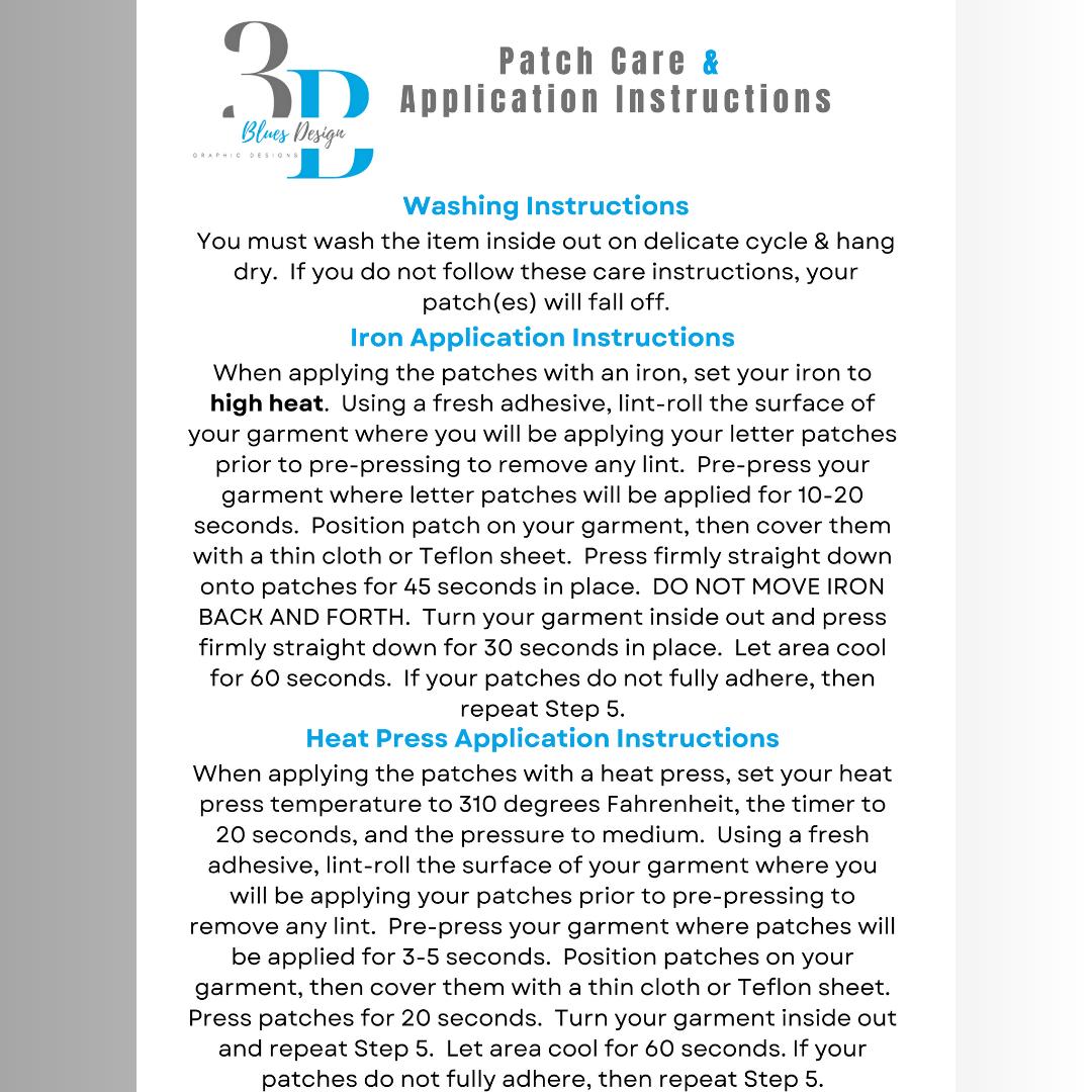 When applying the patches with an iron, set the iron to high heat. Using a fresh adhesive, lint-roll the surface of your garment where you will be applying your letter patches prior to pre-pressing to remove any lint. Pre-press your garment where letter patches will be applied for 10-20 seconds. Position patch on your garment, then cover them with a thin cloth or Teflon sheet. Press firmly straight down onto patches for 45 seconds in place. DO NOT MOVE IRON BACK AND FORTH. Turn your garment inside out and press firmly straight down for 30 seconds in place. Let area cool for 60 seconds. If your patches do not fully adhere, then repeat Step 5.