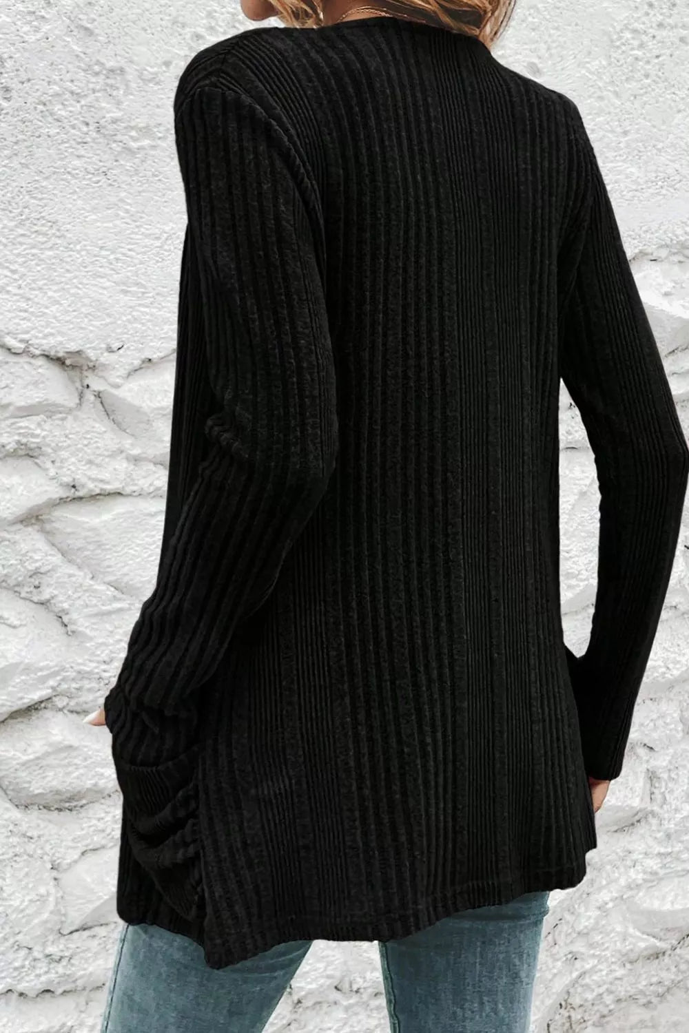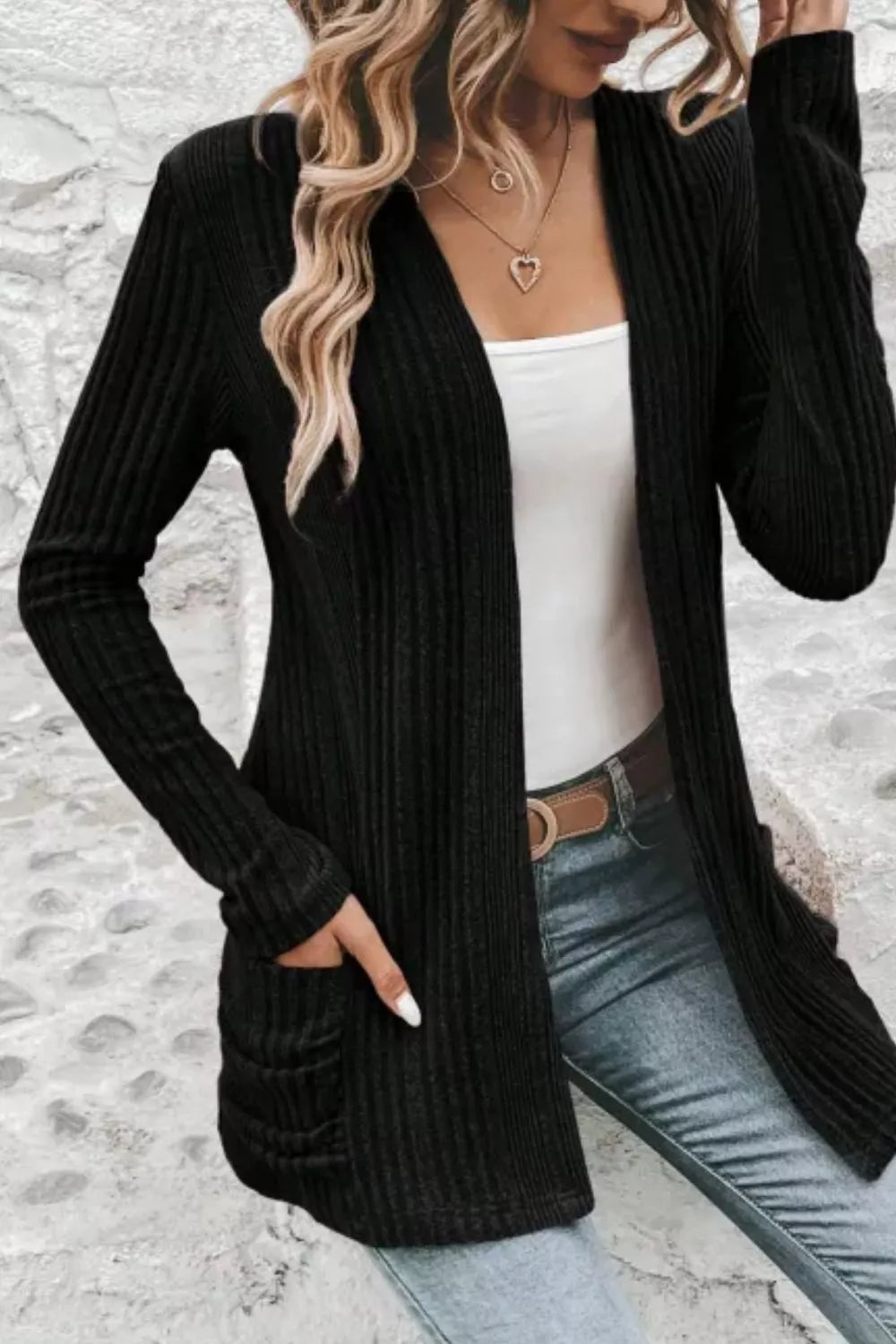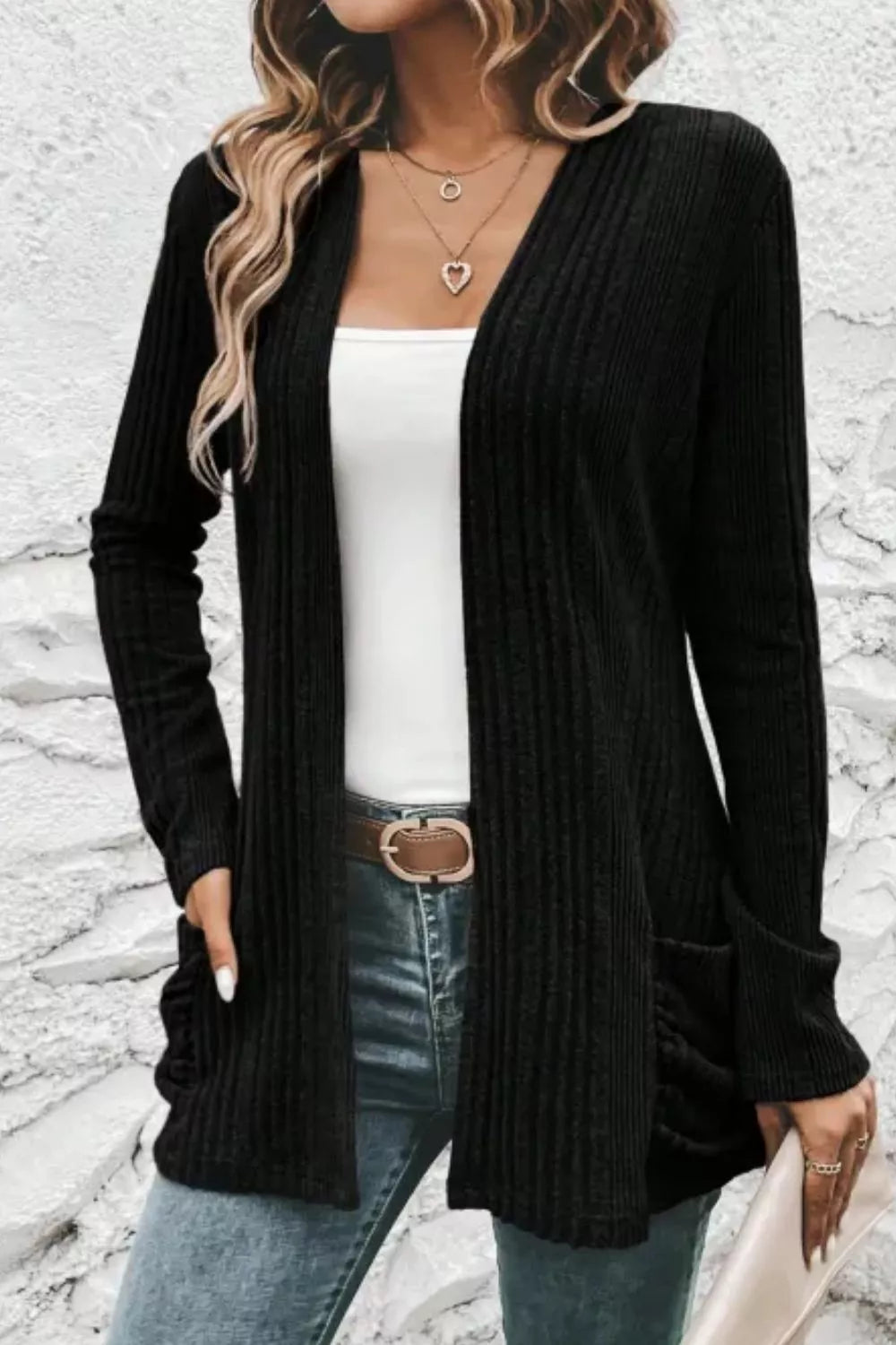 Ribbed Knit Open Front Cardigan with Pockets