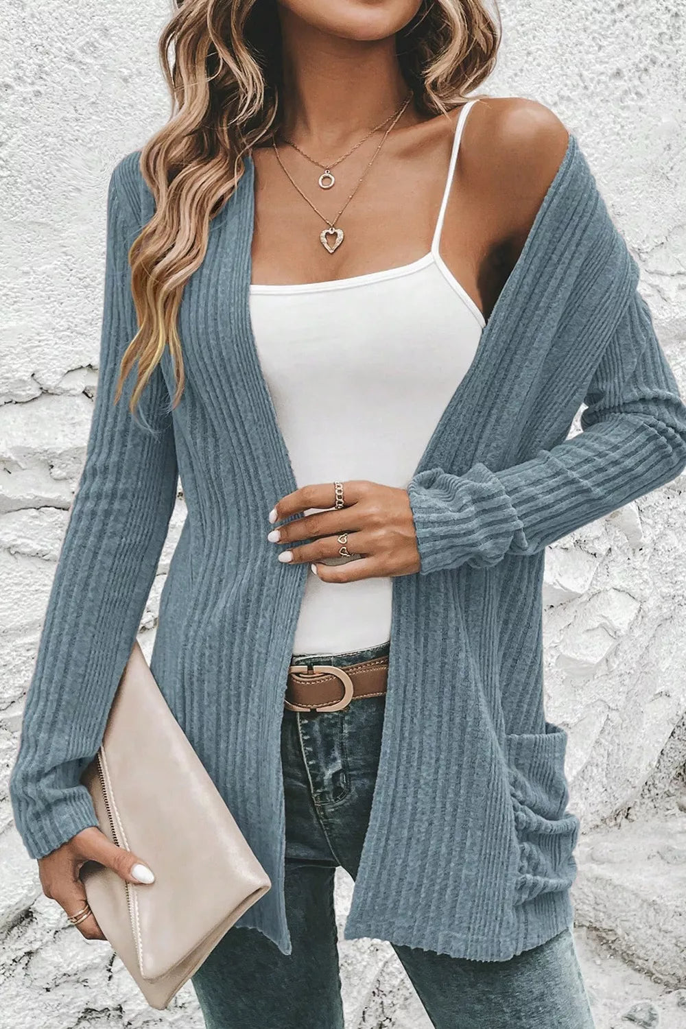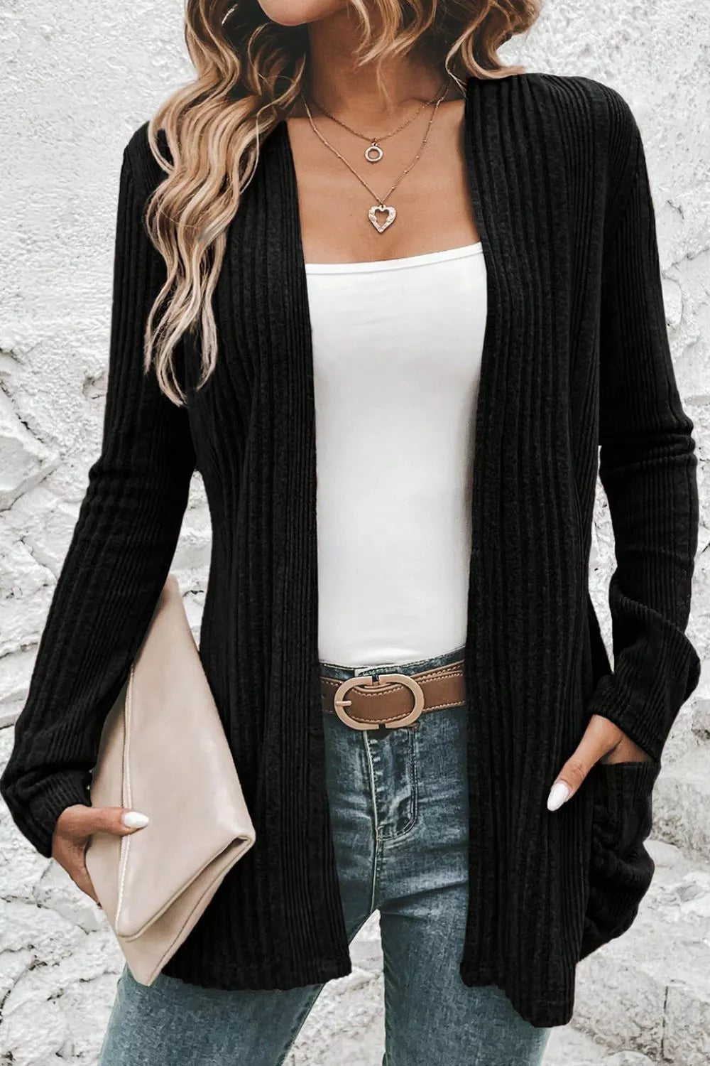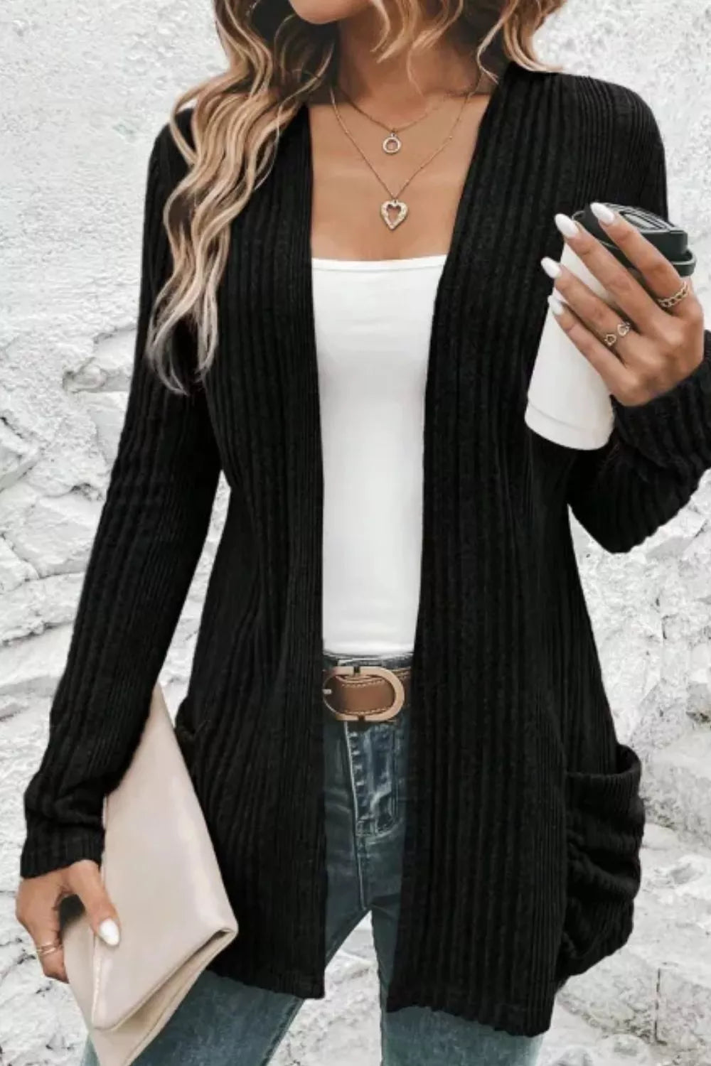 Ribbed Knit Open Front Cardigan with Pockets