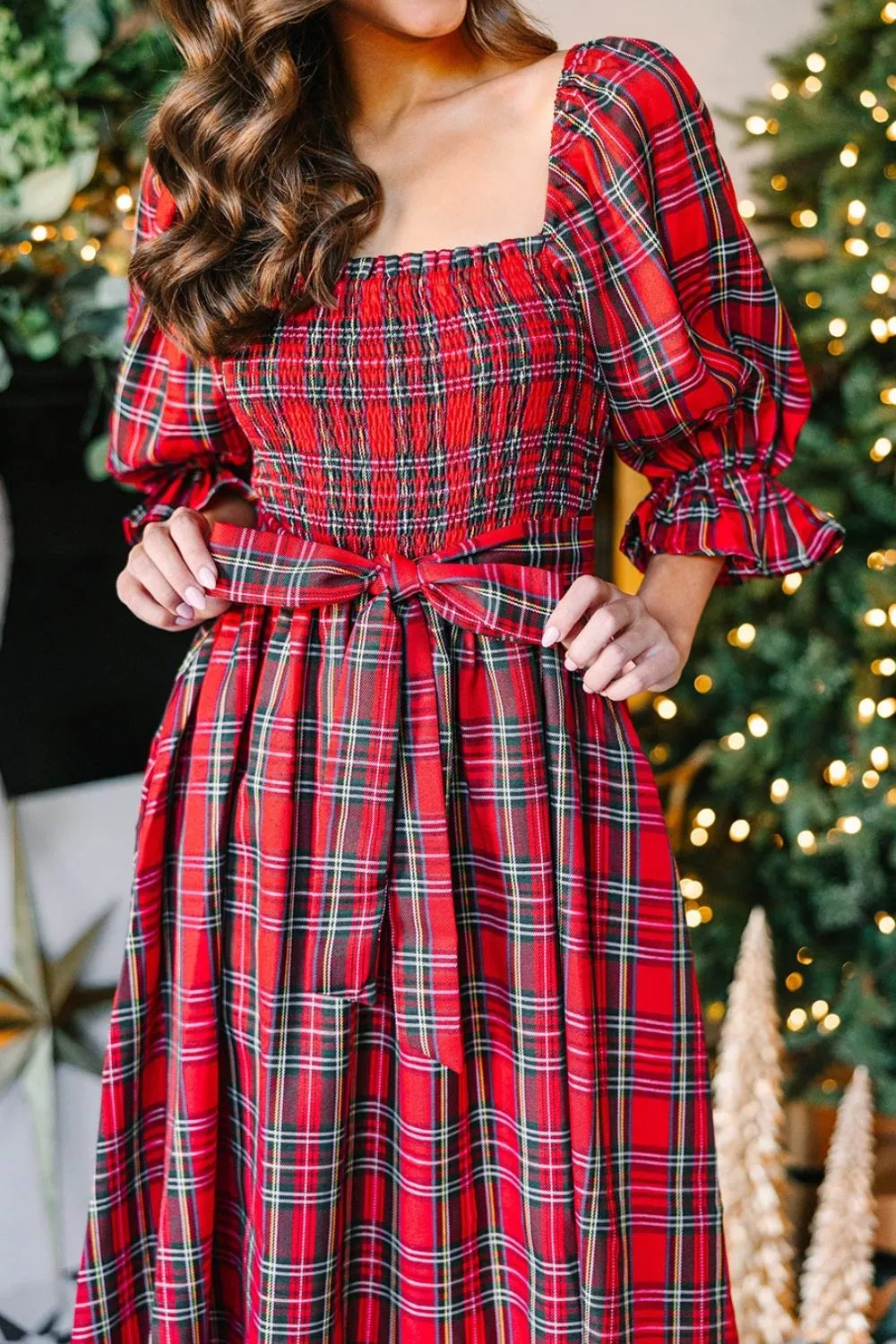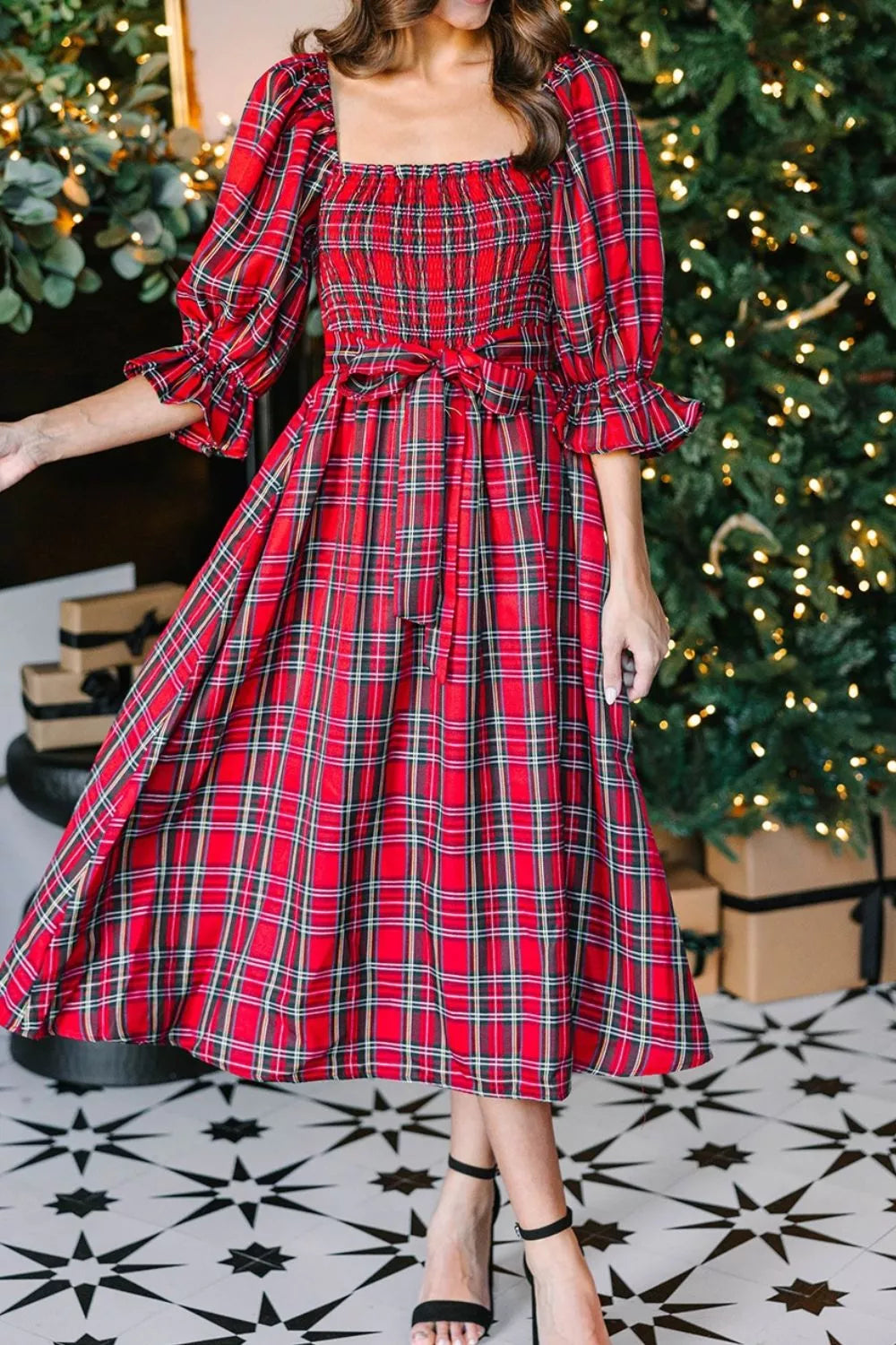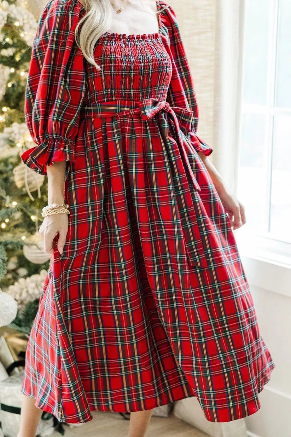 Hazel Blues® | Plaid Smocked Flounce Sleeve Midi Dress