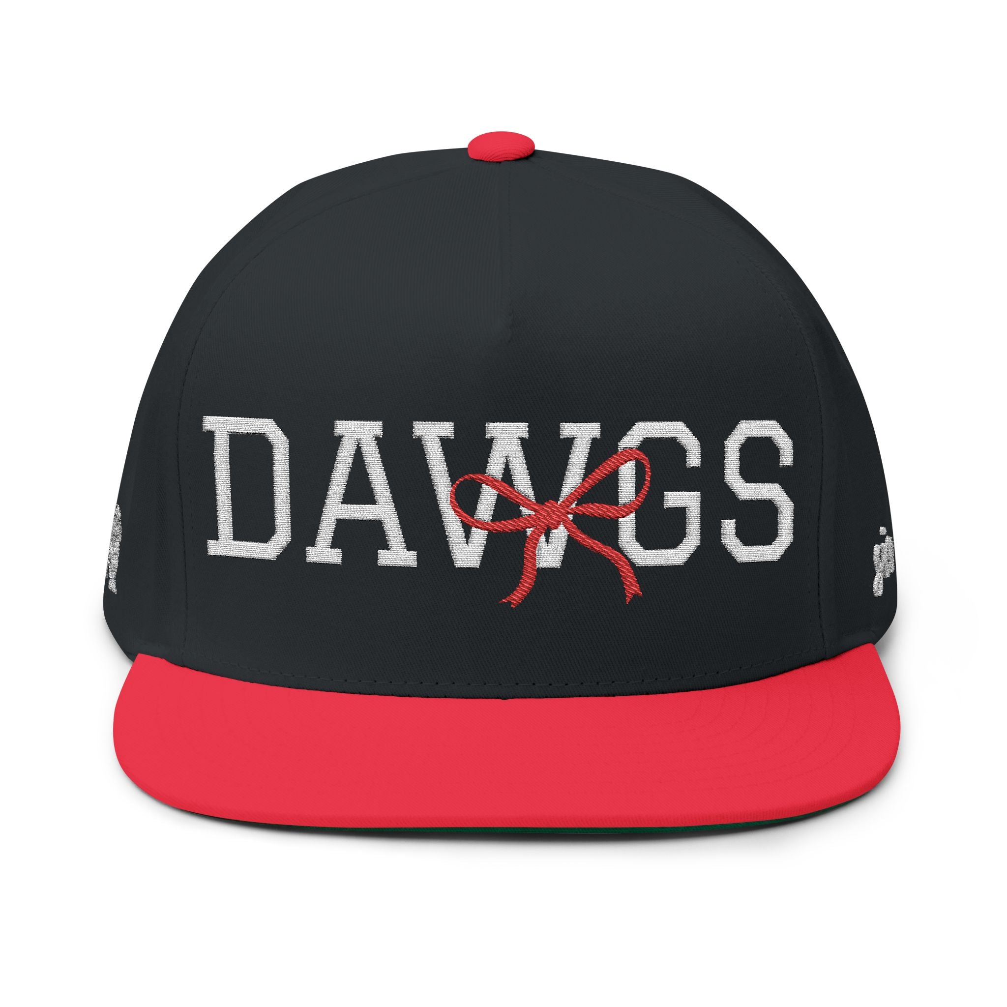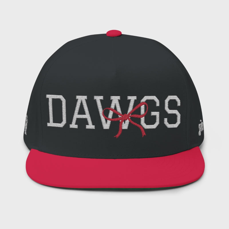 This embroidered DAWGS bow snapback brings bold game-day style with a playful twist. Made from structured cotton twill, it features chunky varsity DAWGS lettering finished with a stitched bow detail. A flat red bill and contrasting green undervisor add retro sport vibes, while the adjustable snapback gives a comfortable, custom fit. Easy to style, easy to love — perfect for game days and everyday wear.