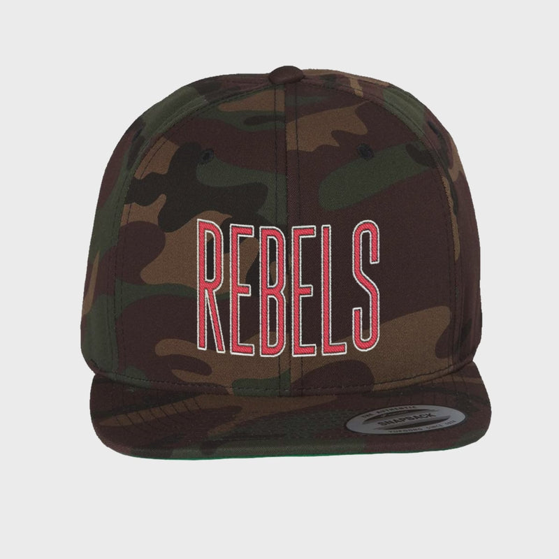 This camo REBELS embroidered snapback hat delivers classic game-day style with a bold, clean finish. The structured high-profile crown keeps its shape, while crisp front embroidery stands out against the camo pattern. A flat bill with green undervisor adds vintage sports appeal, and the adjustable snapback closure ensures a comfortable, customizable fit. Durable, breathable, and made for everyday wear—perfect for Ole Miss fans, tailgates, and casual outfits.