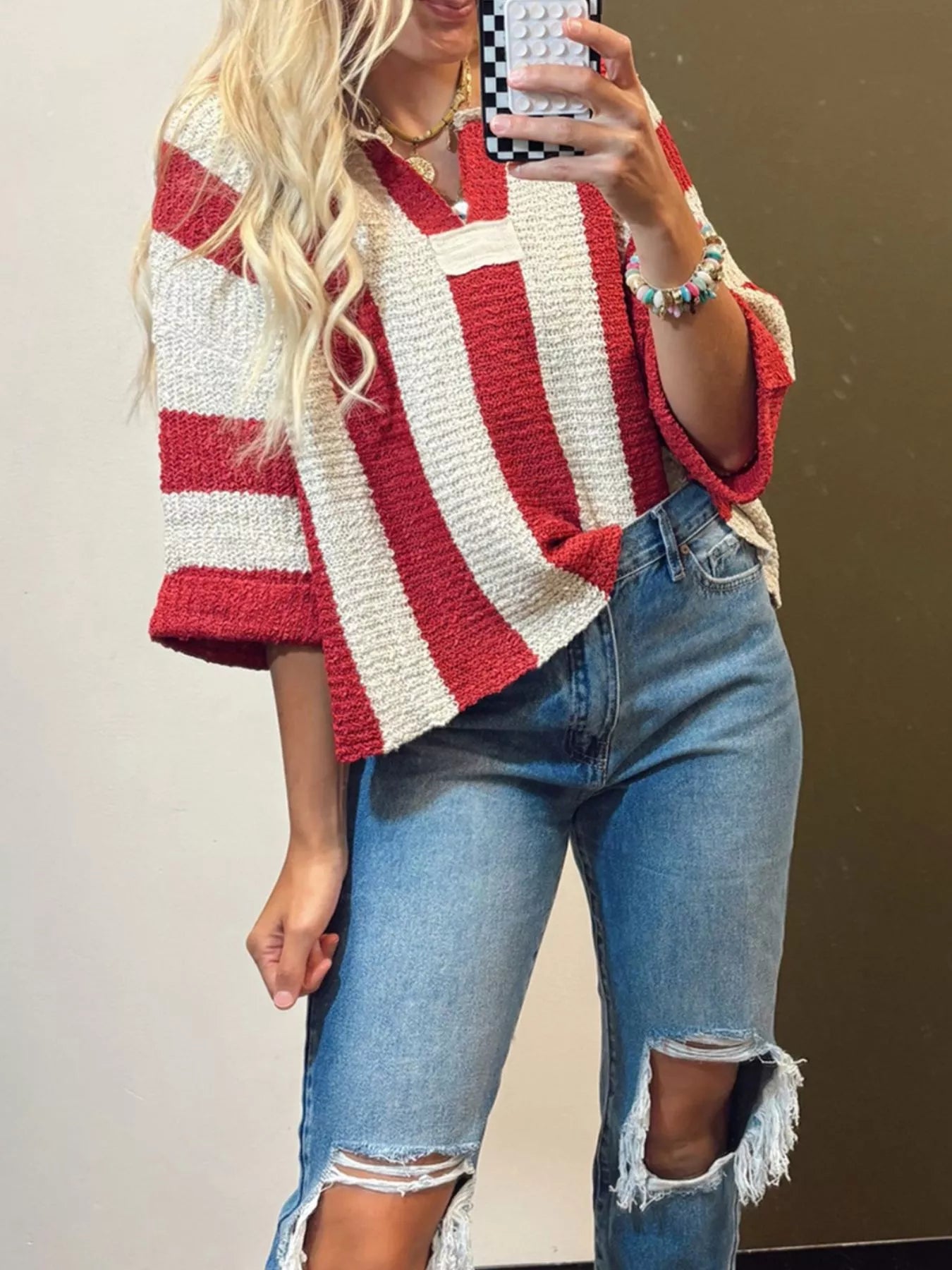 Hazel Blues® | Striped Notched 3/4 Sleeve Sweater