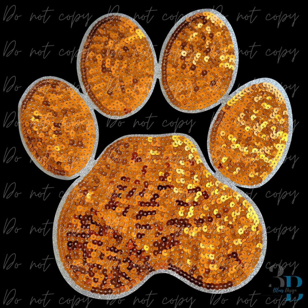 Large Sequin Orange Paw w/Silver Iron-on Patch