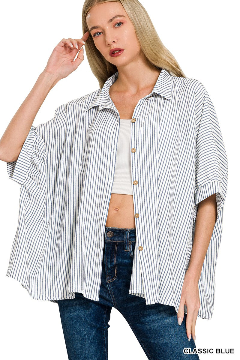 The Woven Stripe Button Down Boxy Top features a stylish and versatile design. Its striped pattern adds a touch of sophistication. The boxy fit gives it a modern and relaxed look. With its button-down front, this top is easy to put on and take off. Perfect for both casual and semi-formal occasions.