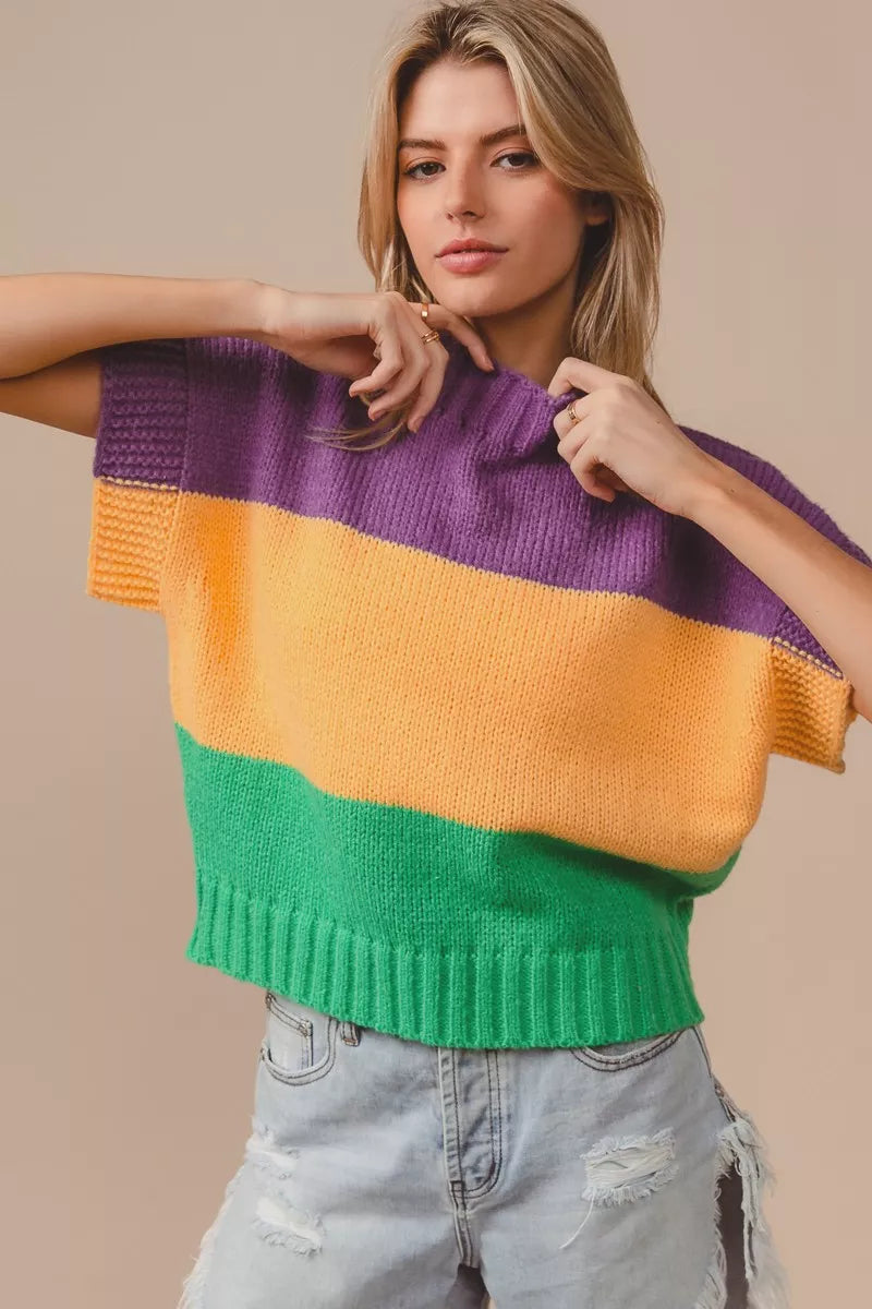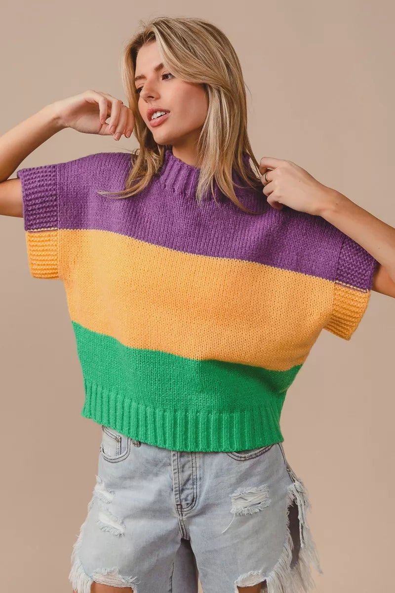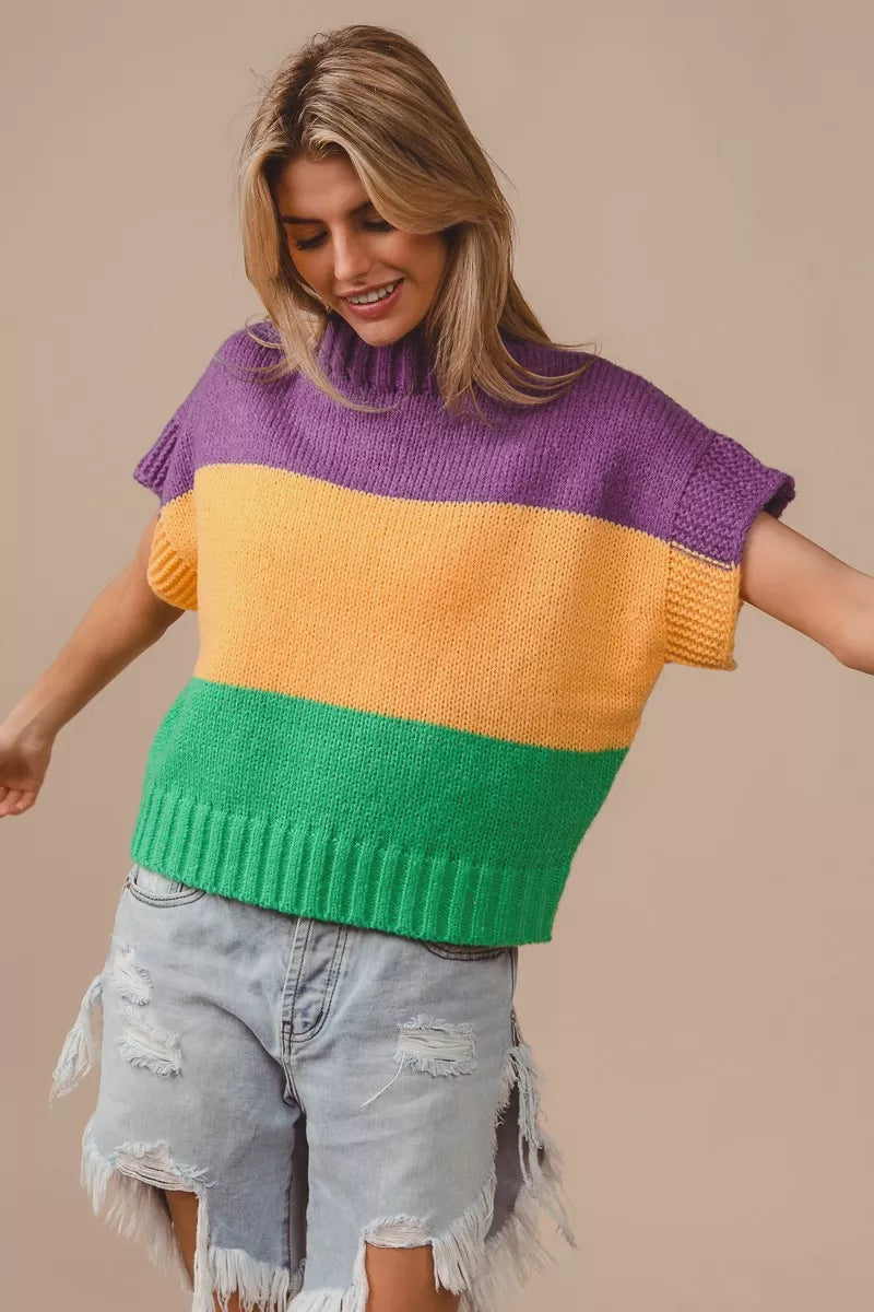 This Mardi Gras Color Block Drop Shoulder Sweater Top is a vibrant and stylish choice for the festive season. The color block design adds a playful and eye-catching element to the sweater. The drop shoulder silhouette offers a relaxed and comfortable fit. Perfect for celebrating Mardi Gras or adding a pop of color to your everyday wardrobe. Stay cozy and chic with this statement sweater top.