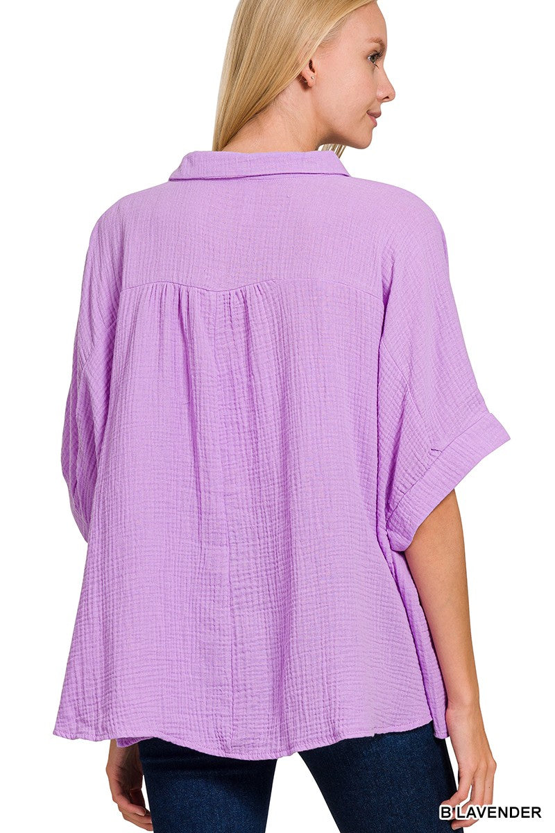The Double Gauze 3/4 Sleeve Button Up Shirt is a breezy and stylish wardrobe essential. Made from lightweight double gauze fabric, this shirt is perfect for staying cool and comfortable in warm weather. The 3/4 sleeves offer a versatile look that can be worn casually or dressed up. The button-up design adds a classic touch and allows for easy layering. Pair this shirt with jeans for a relaxed weekend outfit or with trousers for a more polished ensemble. A versatile piece that can be dressed up or down for any occasion.