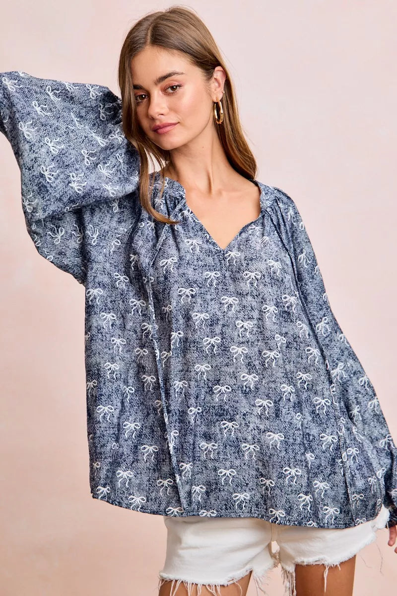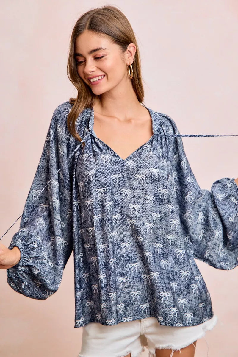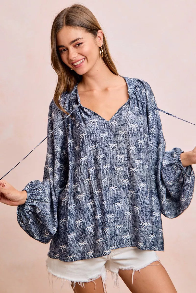 Hazel Blues® | BiBi Ribbon Bow Print Exaggerated Balloon Sleeves Top