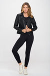 Studded Classic Moto Faux Leather Jacket is a bold and chic statement piece that exudes attitude and style. Crafted from high-quality faux leather, this jacket features studded details on the shoulder patch for a touch of edgy flair. The zipper arm sleeves add a modern and dynamic element to the design, while the zipper pockets offer both style and functionality. Featuring an asymmetrical zipper closure, this jacket has a unique and eye-catching appeal that sets it apart from the rest. Elevate your look with the Studded Classic Moto Faux Leather Jacket and make a fashion-forward statement wherever you go.