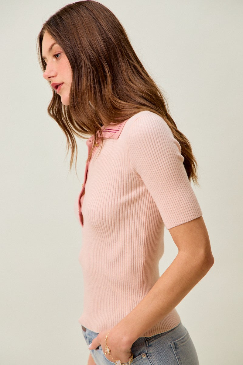 The Contrast Collar Stretchy Rib Knit Short Sleeve Top is a modern and chic wardrobe staple. Featuring a contrasting collar, this top adds a unique touch to any outfit. The rib knit fabric provides a comfortable and stretchy fit. The short sleeves make it perfect for layering or wearing on its own. Versatile and stylish, this top can be dressed up for a sophisticated look or dressed down for a casual ensemble.