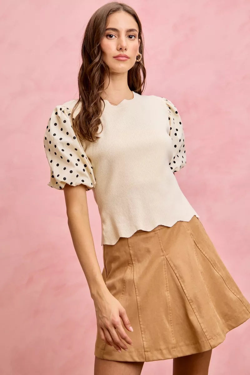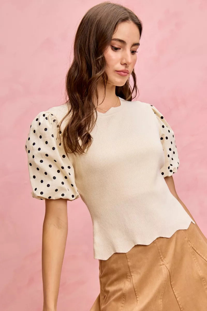 The Polka Dot Contrast Woven Balloon Sleeve Blouse is a chic and sophisticated addition to your wardrobe. Featuring a classic polka dot pattern, this blouse offers a timeless and stylish look. The contrast woven details on the balloon sleeves add a modern and eye-catching touch. With its balloon sleeves providing a dramatic and fashion-forward silhouette, this blouse is perfect for making a statement. Dress it up or down for versatile styling options that suit any occasion. Elevate your fashion game with the Polka Dot Contrast Woven Balloon Sleeve Blouse and showcase your trendy and elegant style effortlessly.