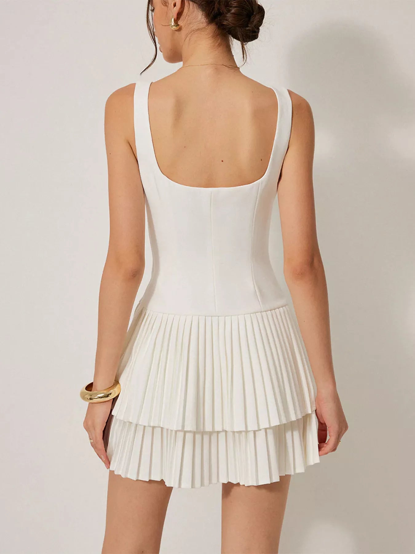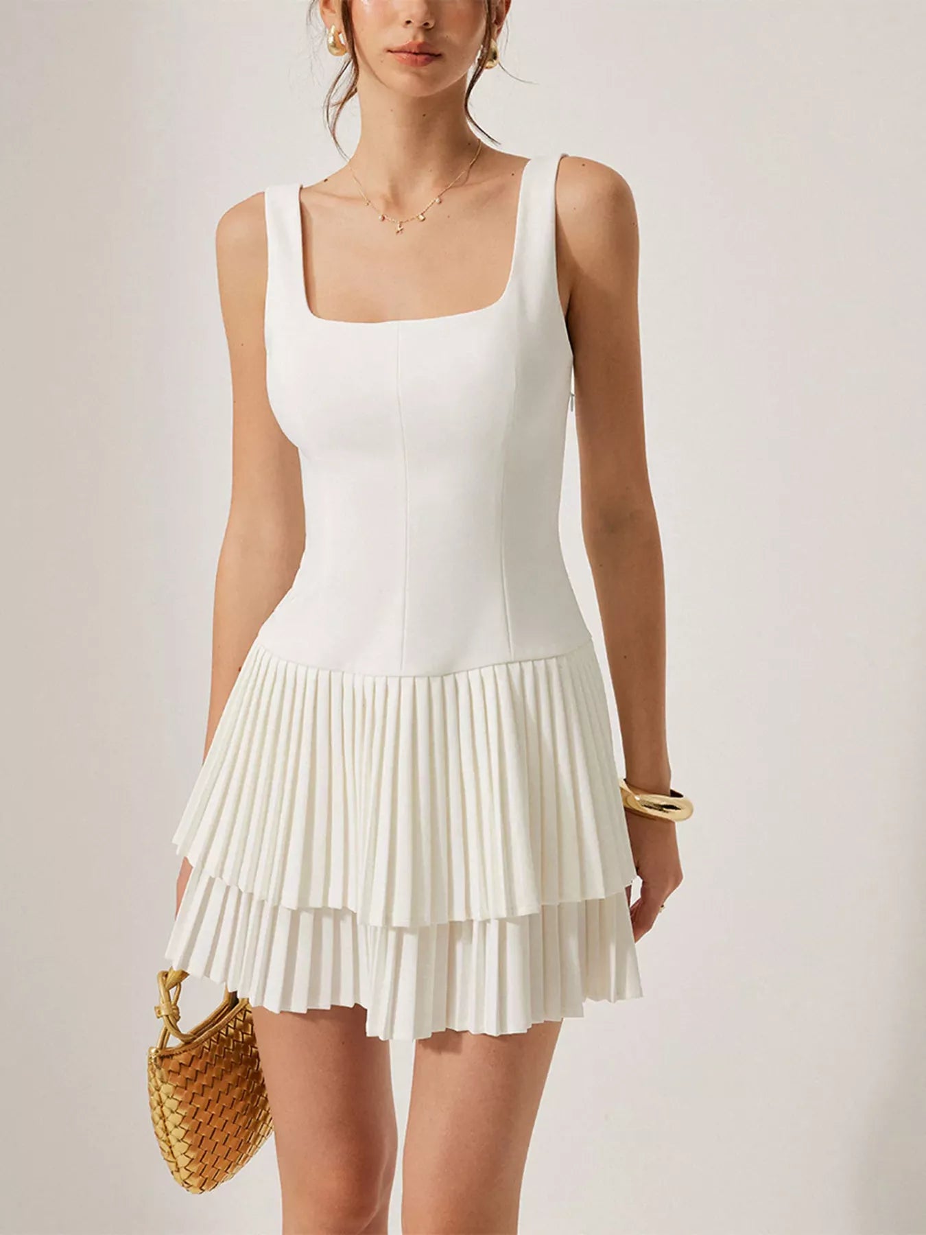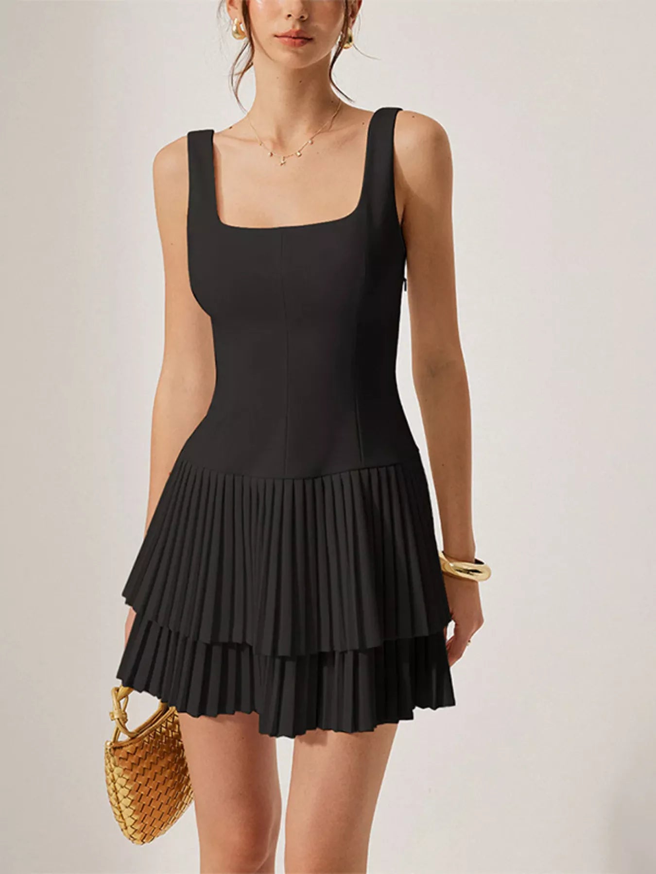 Square Neck Pleated Mini Dress
