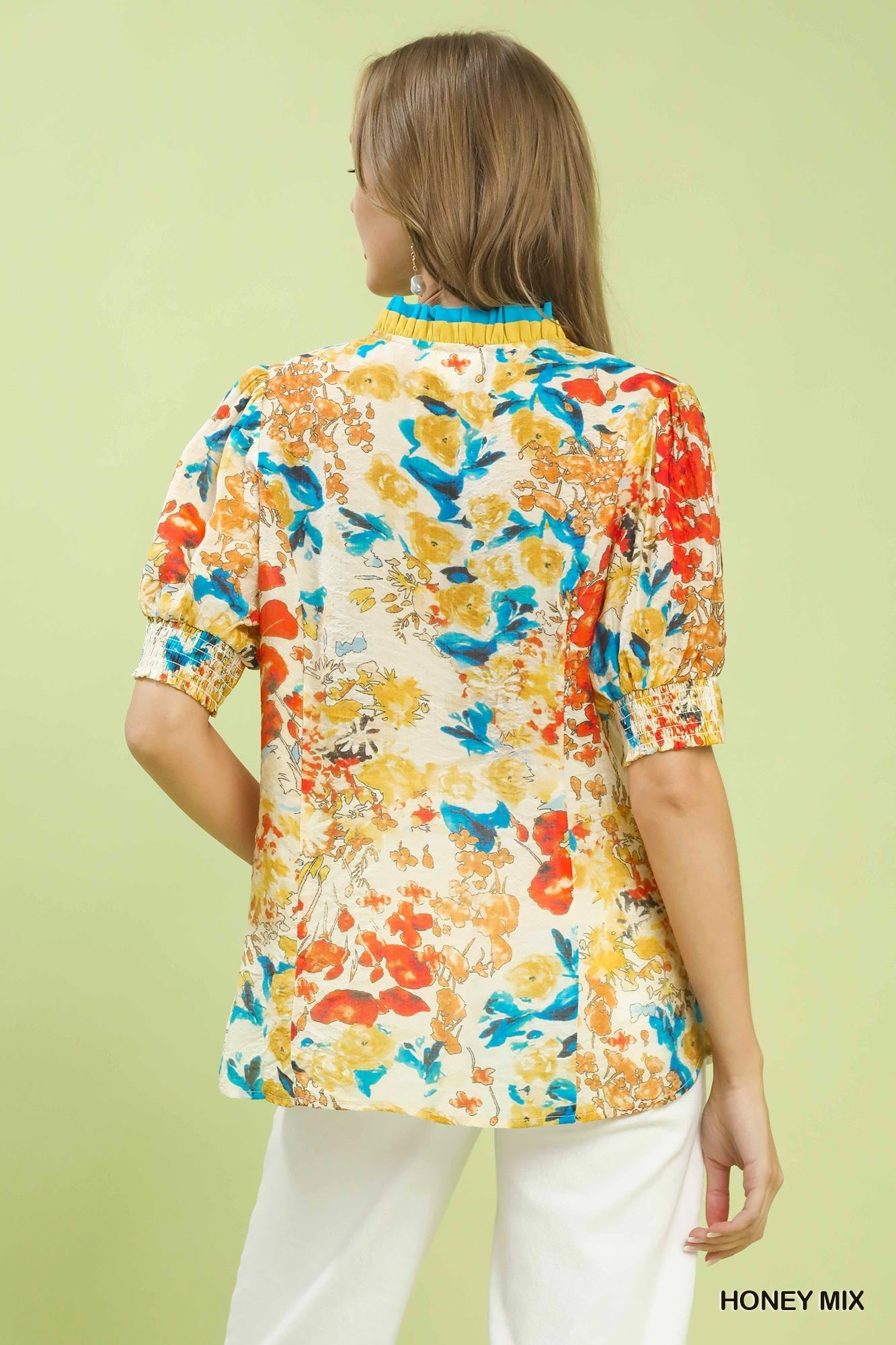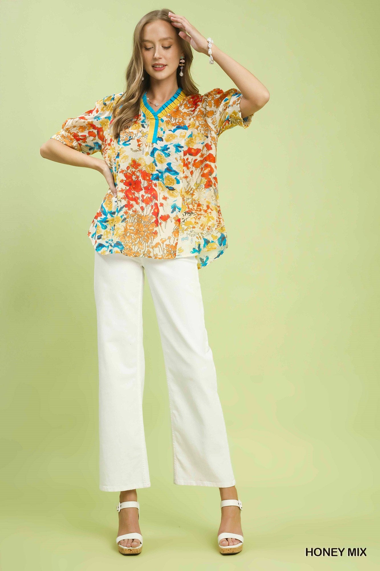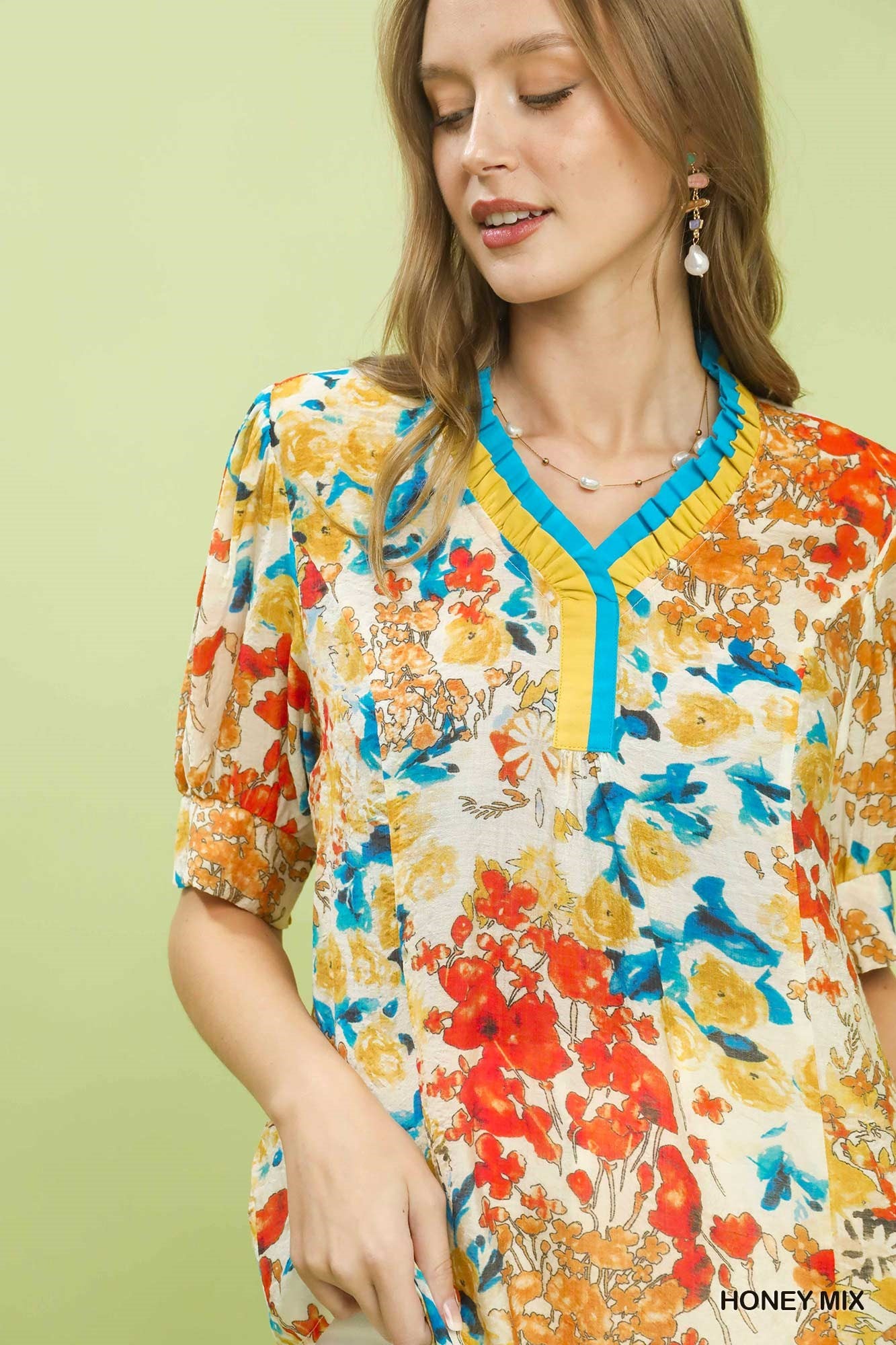 Umgee Floral Contrast Pleat Neck Top