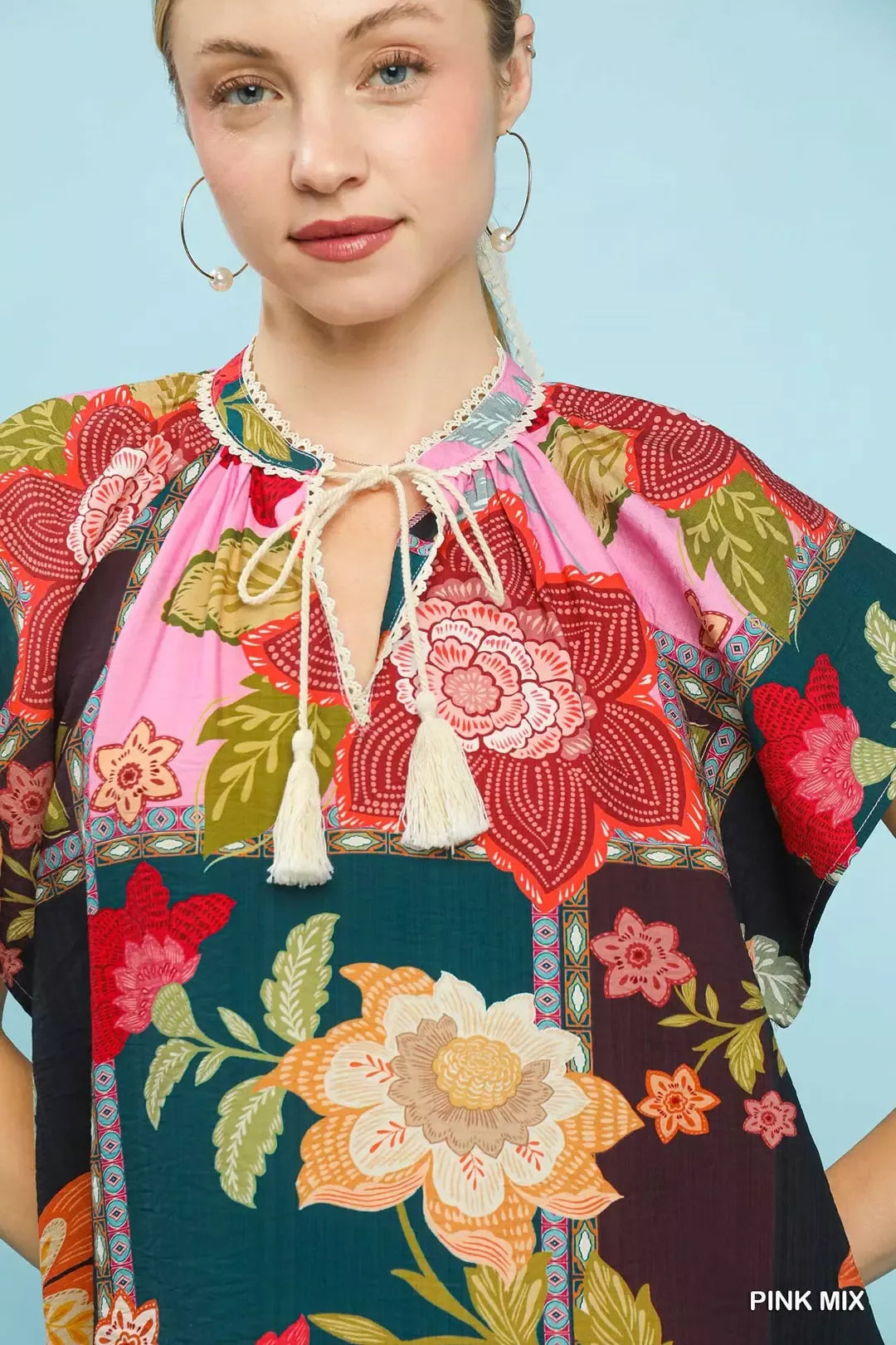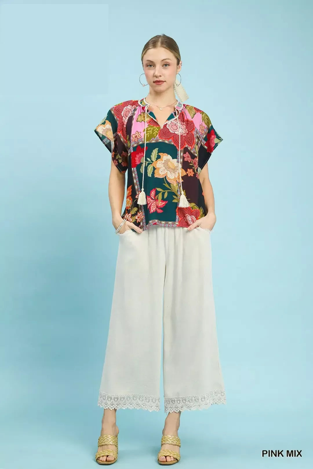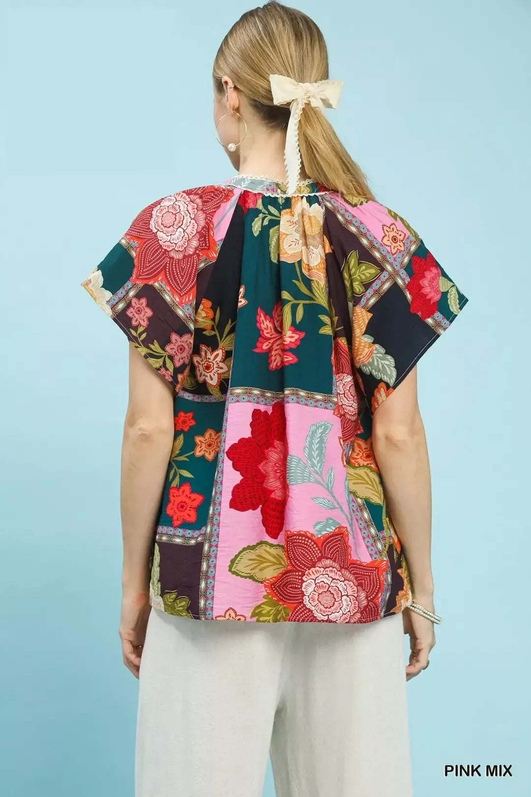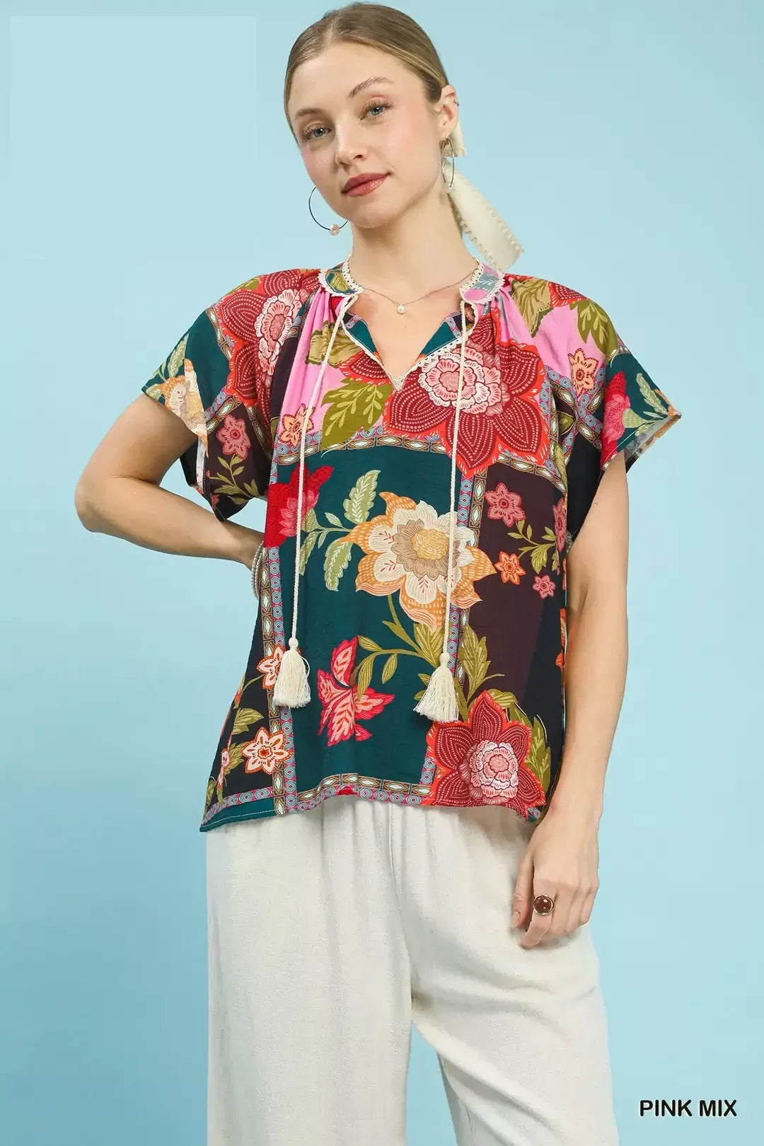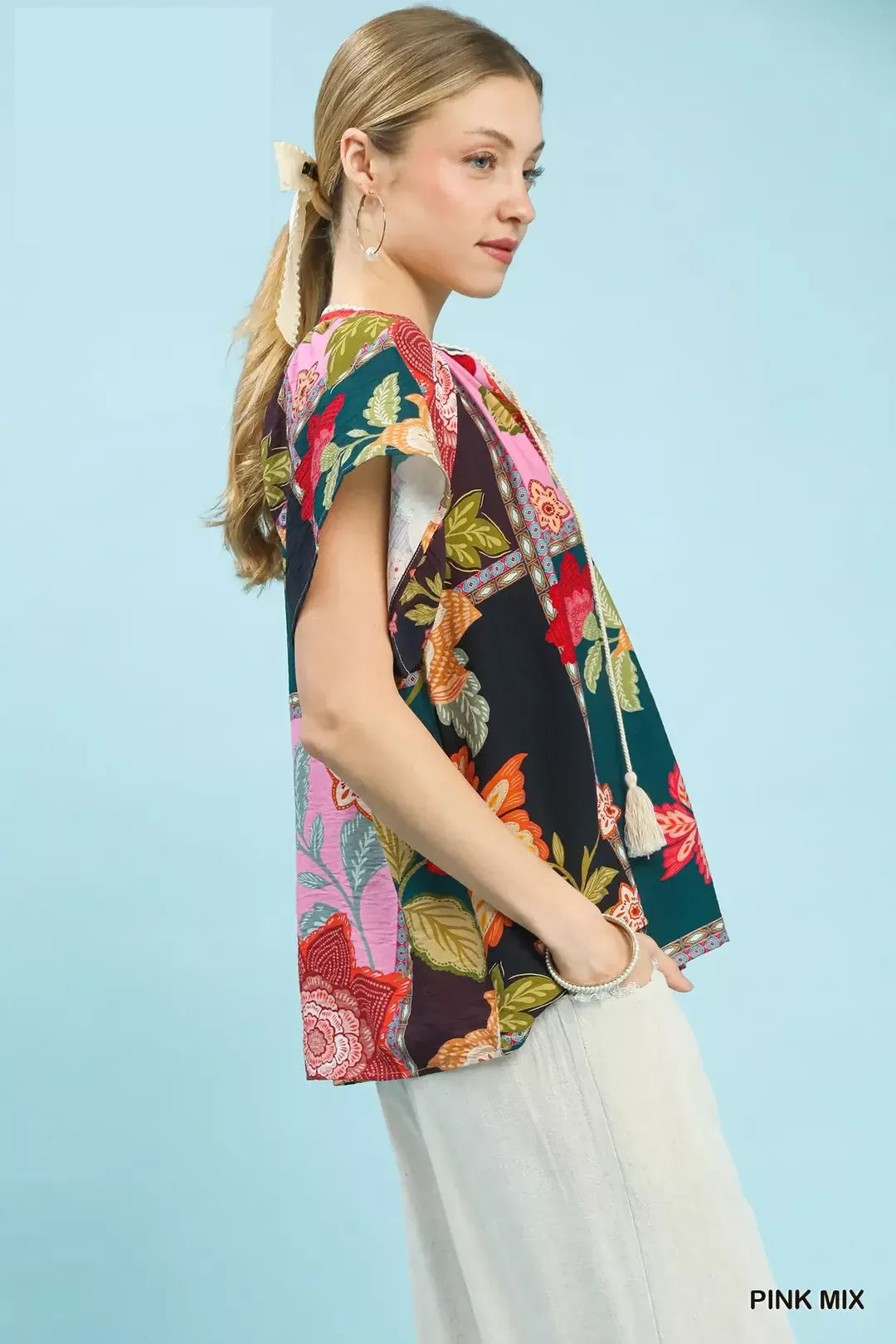 Boasting eye-catching mixed floral patchwork detailing, this unique top radiates free-spirited boho charm and laid-back summer style. Accented with delicate lace trim for soft feminine texture, it features a cozy round neckline finished with a tassel front tie to adjust the fit and add playful flair. Short sleeves bring breezy comfort for warm days, while the relaxed cut ensures unrestricted movement and all-day wearability. Unlined and lightweight, this casual piece blends artistic patchwork prints with subtle romantic details. Effortlessly versatile to pair with denim, shorts and casual bottoms, it’s ideal for vacations, garden outings, weekend gatherings and daily casual looks.