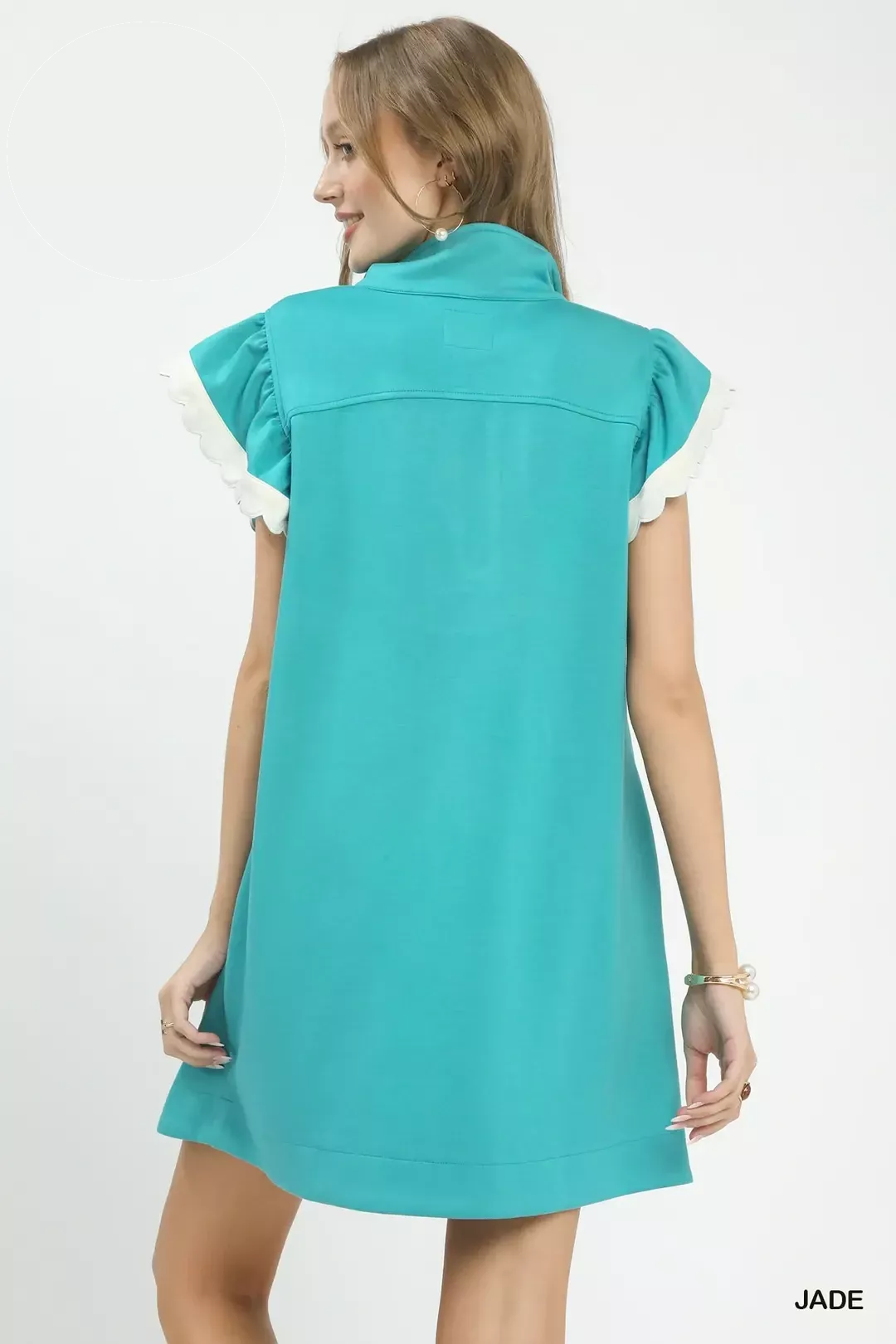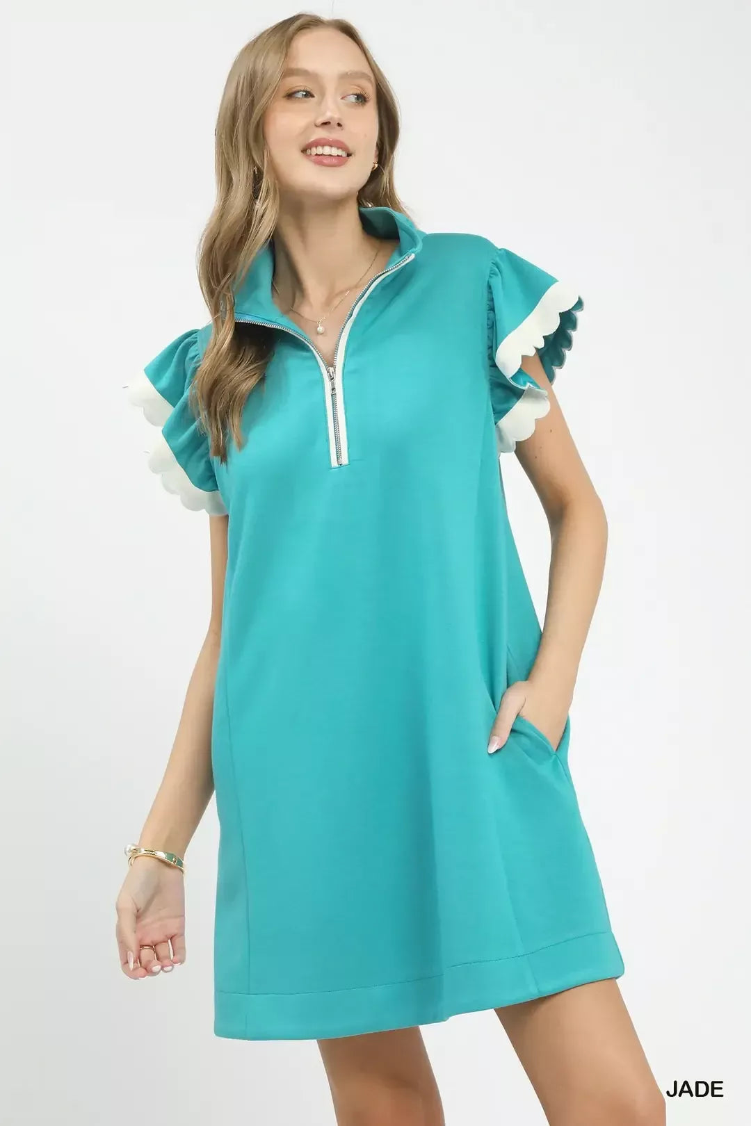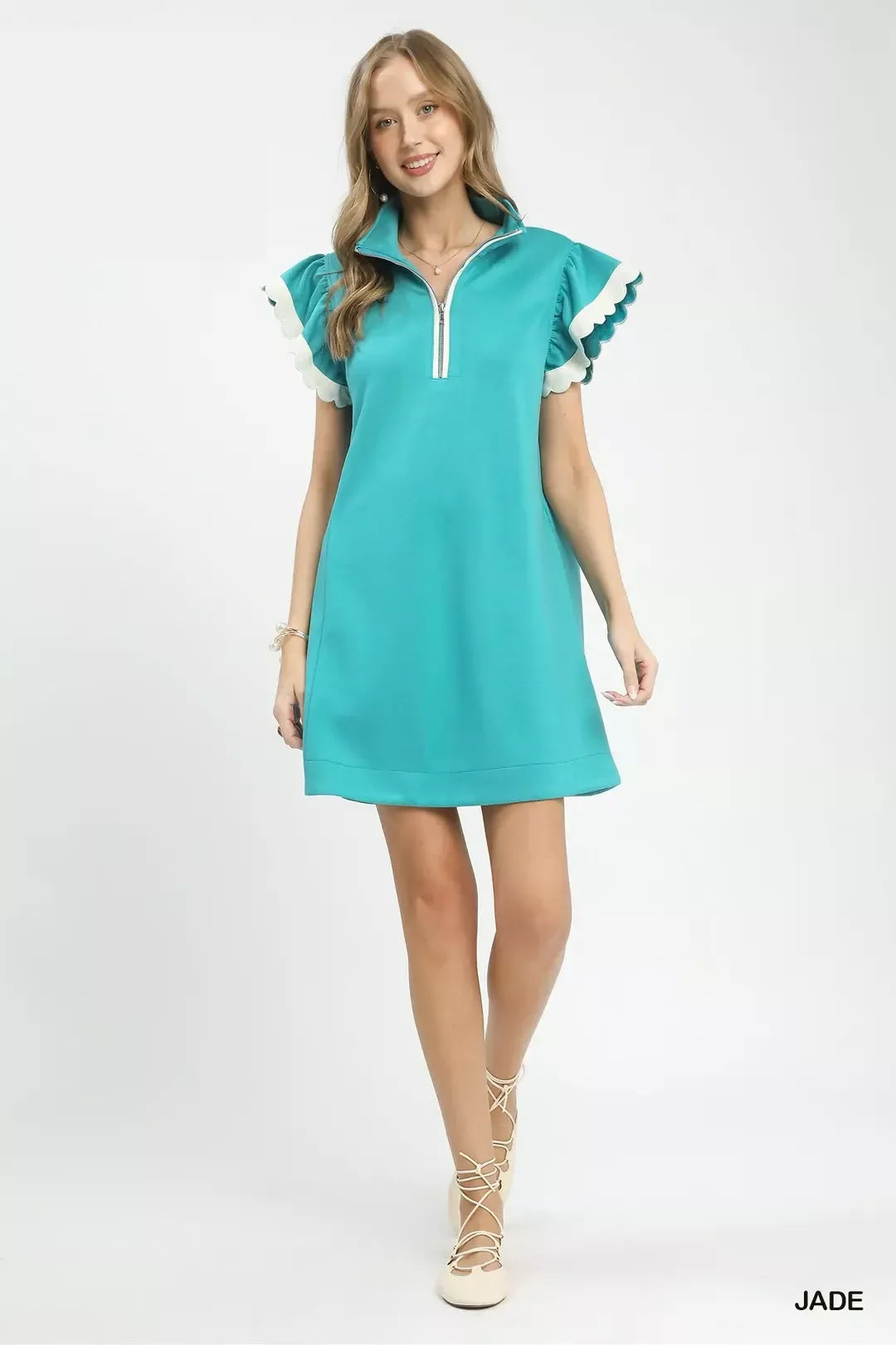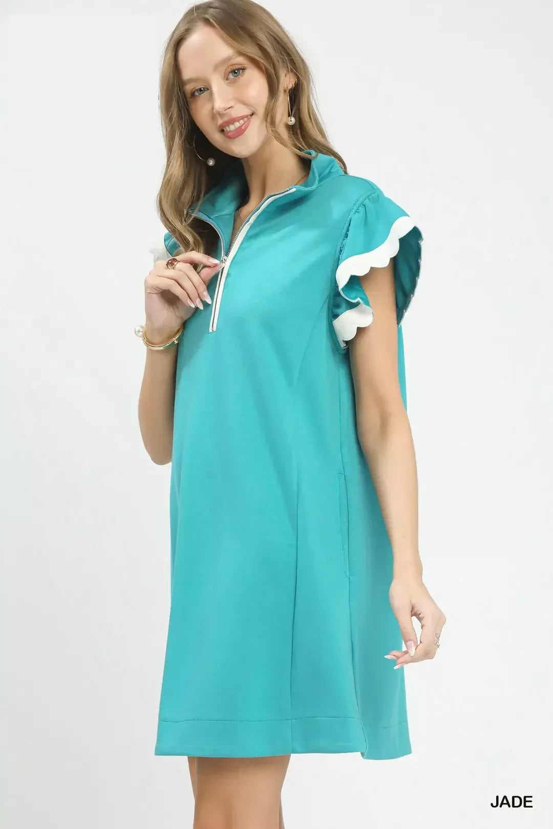 This effortless everyday dress features a modern zip-neck design paired with soft flutter sleeves for a balanced mix of casual ease and feminine charm. The adjustable zip neck allows for flexible styling and customized coverage, while lightweight flutter sleeves deliver breezy comfort and gentle movement. Crafted in a relaxed, figure-friendly silhouette, it offers all-day breathability and a flattering drape. Minimalist yet stylish, this versatile piece transitions seamlessly from daily outings and brunch to weekend getaways. Easy to accessorize and wear solo, it makes a timeless warm-weather essential for your wardrobe.